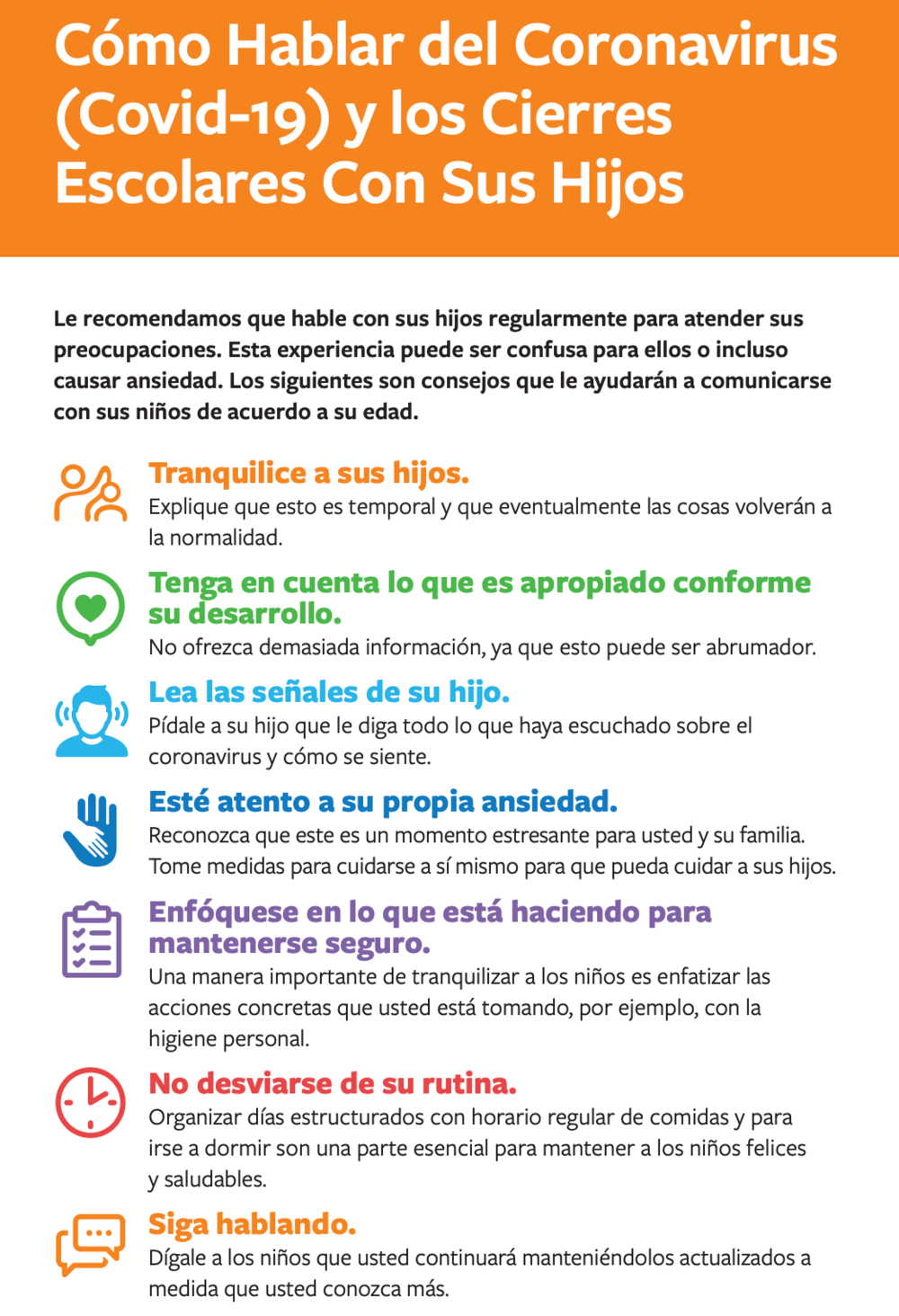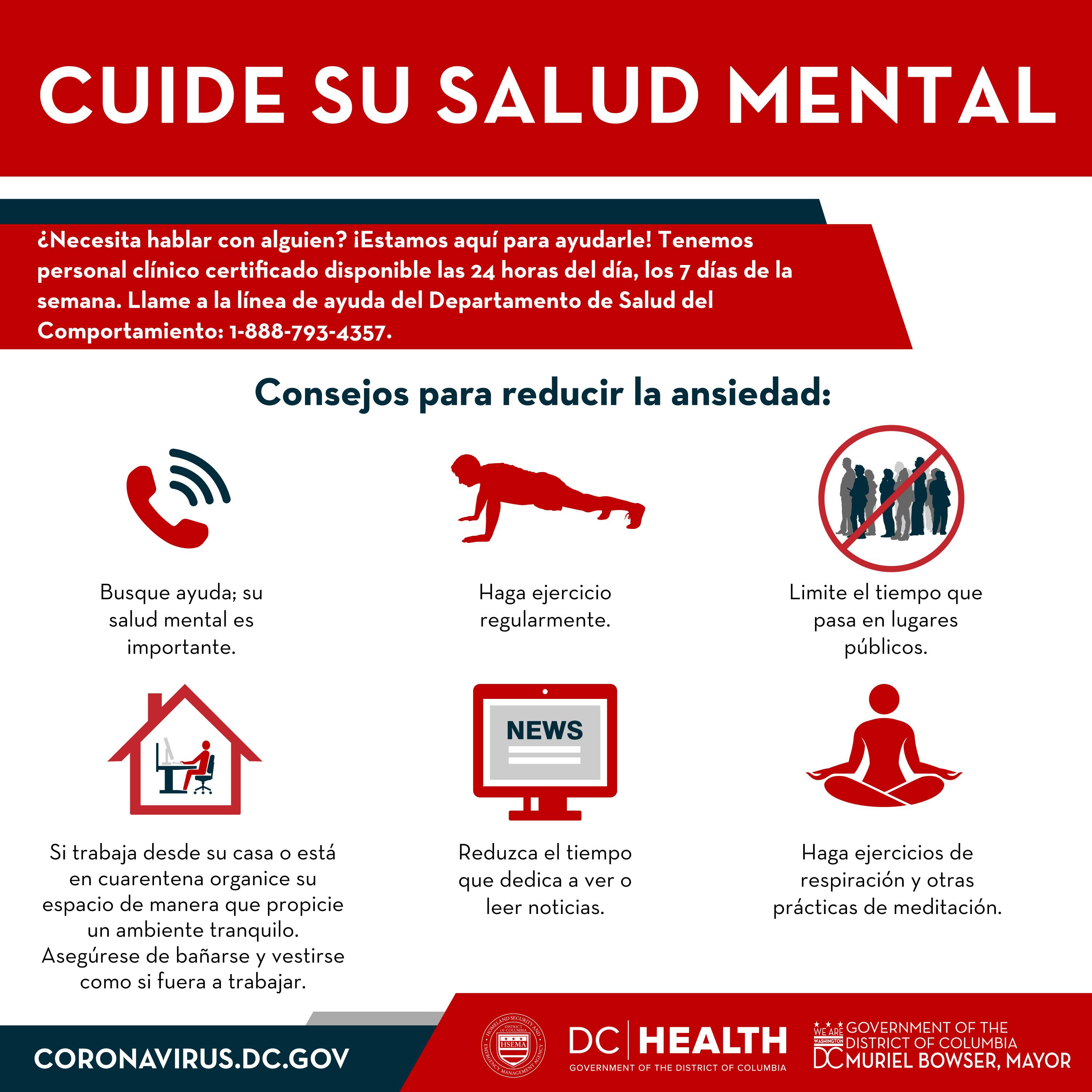 Si usted o alguien a quien usted quiere se sienten abrumados con emociones como tristeza, depresión o ansiedad, o sienten que quieren hacerse daño a sí mismos o a los demás, llame: al 911a la línea telefónica de ayuda para sobrellevar la angustia provocada por desastres de la Administración de Salud Mental y Abuso de Sustancias (SAMHSA): 1-800-985-5990 o envíe un mensaje de texto que diga TalkWithUs al 66746. (Línea TTY: 1-800-846-8517)
