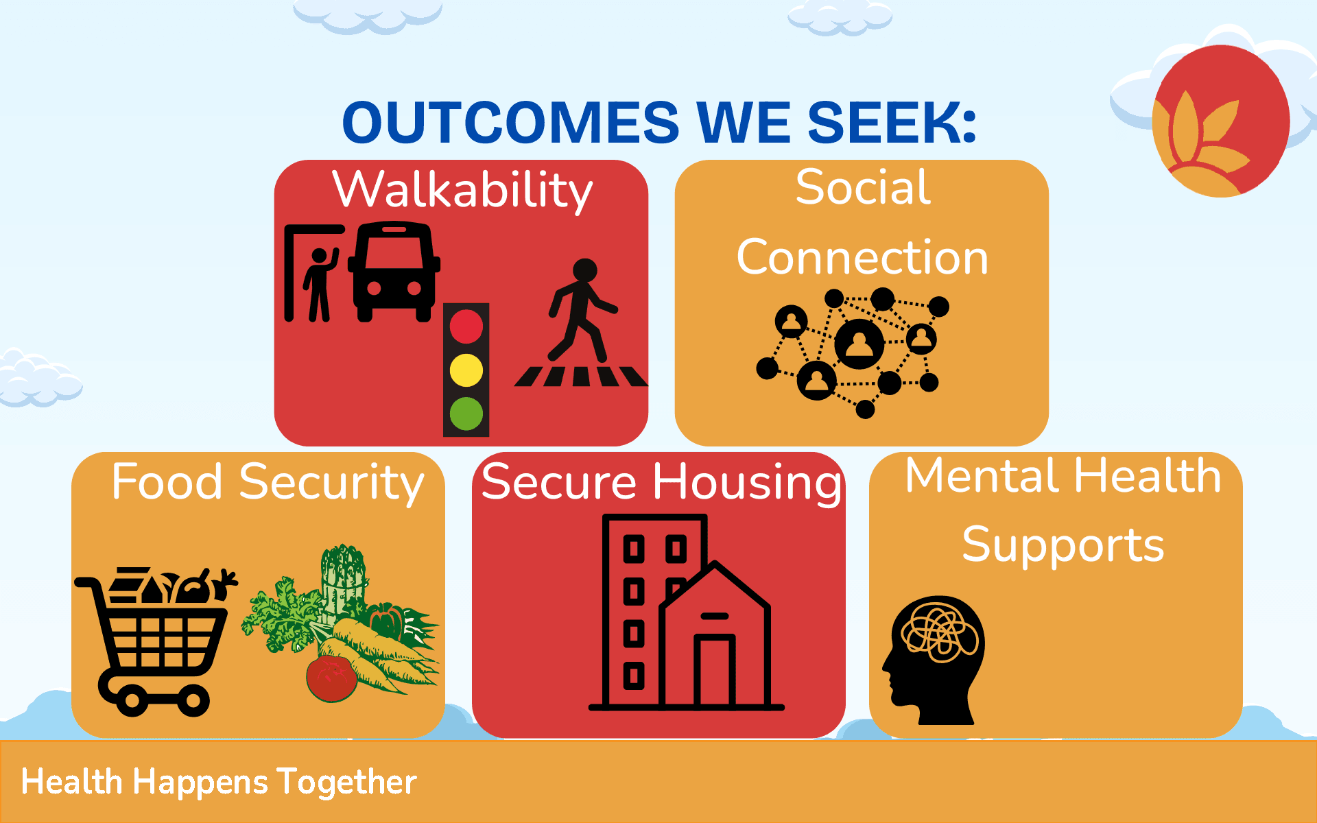 - After the pandemic, worked to identify new local address priority focus areas including: access to healthy food, increasing walk ability, access to mental health services, improving social connection and secure housing.